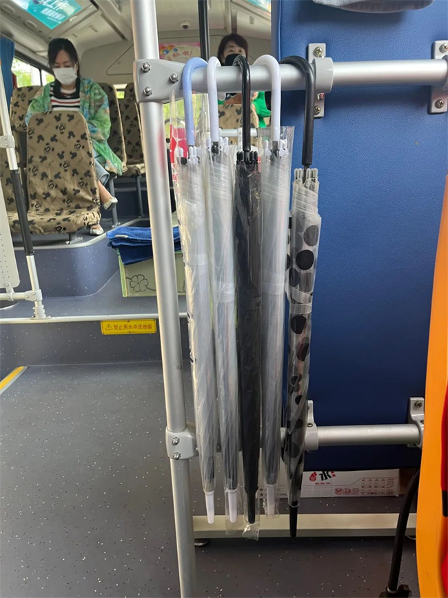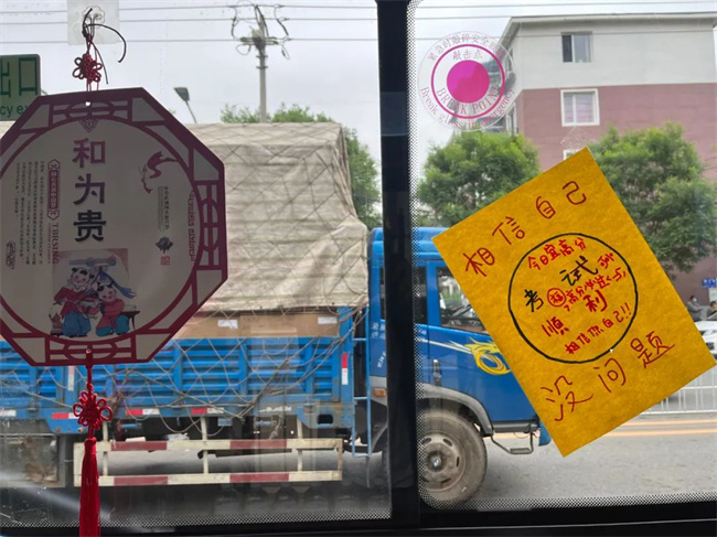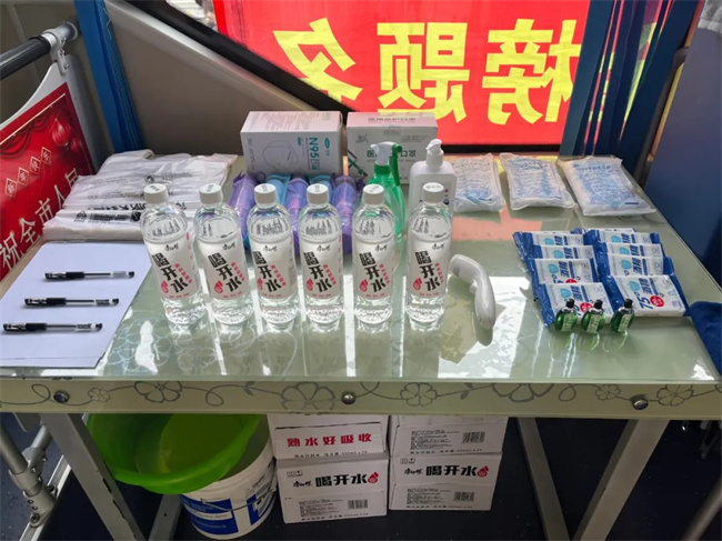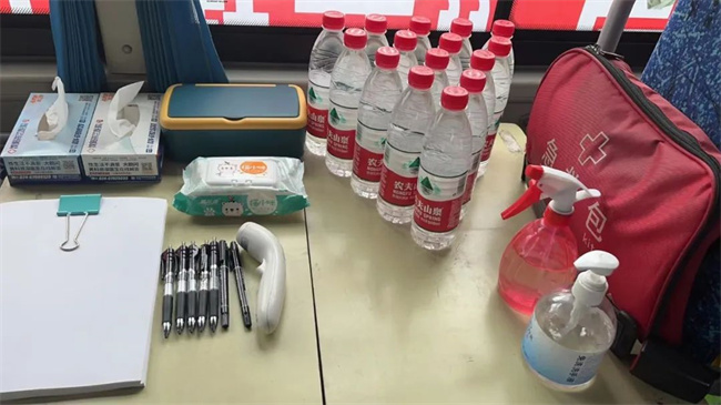 車(chē)內(nèi)雨傘、礦泉水、消毒液、消毒濕巾、口罩等一應(yīng)俱全,車(chē)身上還懸掛有“高考愛(ài)心服務(wù)車(chē) 217路為您服務(wù)”等字樣的條幅,這是張玲為了參與愛(ài)心助力高考活動(dòng),提前精心布置的車(chē)輛。