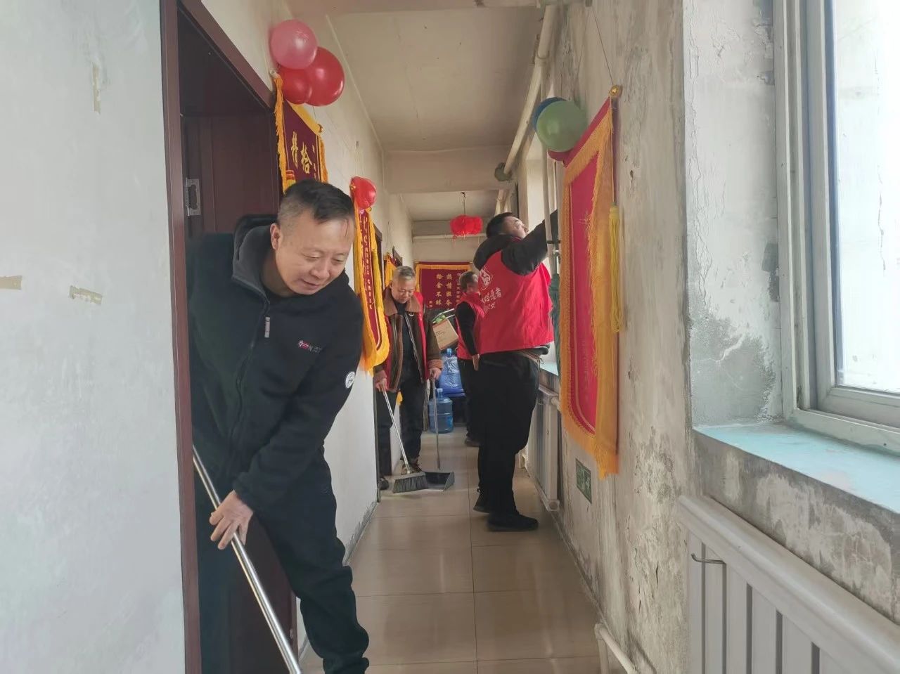 志愿者們忙碌的身影在養(yǎng)老院里穿梭,雖然大家都忙得滿頭大汗,但沒有一個(gè)人喊累??粗先藗兡樕涎笠绲男θ?,志愿者們心里也充滿了成就感。