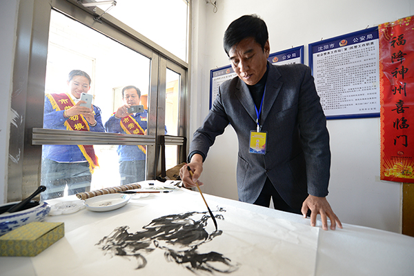 文藝演出后,書(shū)畫(huà)藝術(shù)家們與集團(tuán)公司勞動(dòng)模范、星級(jí)駕駛員在通利公司一樓大廳進(jìn)行了書(shū)畫(huà)藝術(shù)交流,現(xiàn)場(chǎng)展示了藝術(shù)家書(shū)法、繪畫(huà)創(chuàng)作全過(guò)程,讓駕駛員們親身感受書(shū)畫(huà)創(chuàng)作的藝術(shù)魅力。