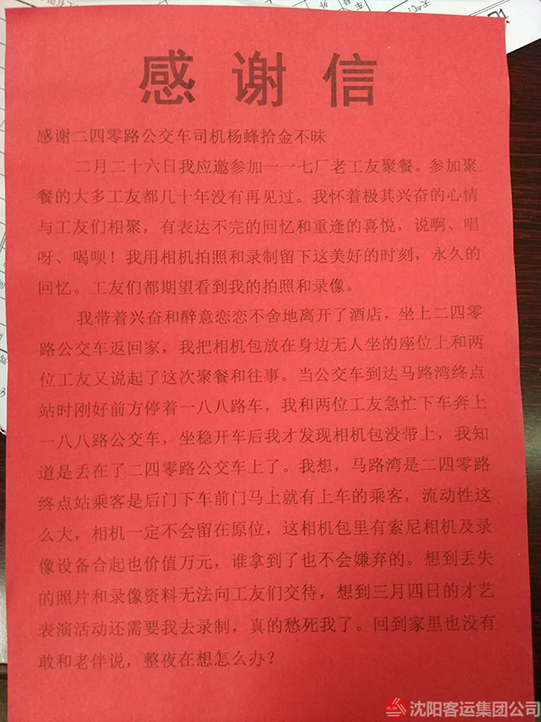 原來,當日下午徐沛華老人剛剛參加完老工友聚會,在乘坐240路公交車回家時將攜帶的攝影包遺落在車上,到家后才發(fā)現(xiàn)自己的攝影包丟失了。老人回想可能是遺落在240路車上了,他抱著試試看的態(tài)度來到240車隊,令他沒想到的是,相機完好無損的在那里等待它主人的到來,失而復(fù)得的喜悅讓老人激動不已,老人說,“昨晚我一夜沒有睡好,相機里的照片和視頻對我來說是非常珍貴的,要是丟了我真不知道怎么辦才好,真的非常感謝駕駛員楊峰同志......”隨后,老人親自把“拾金不昧 弘揚正氣”的錦旗送到了楊峰手中,“楊師傅的這種拾金不昧的精神是雷鋒精神的一種傳承,是現(xiàn)在年輕人學(xué)習(xí)的榜樣”,老人激動的說。在公交車這個不足十平米的車廂里,楊峰用自己的善舉為城市文明傳遞著一份正能量。